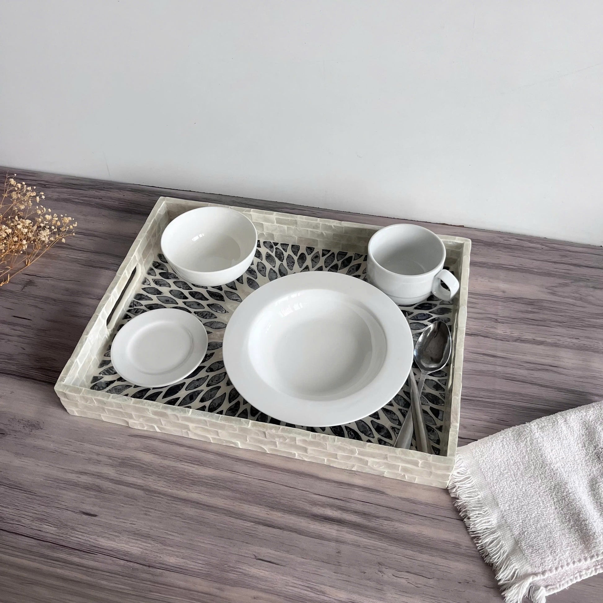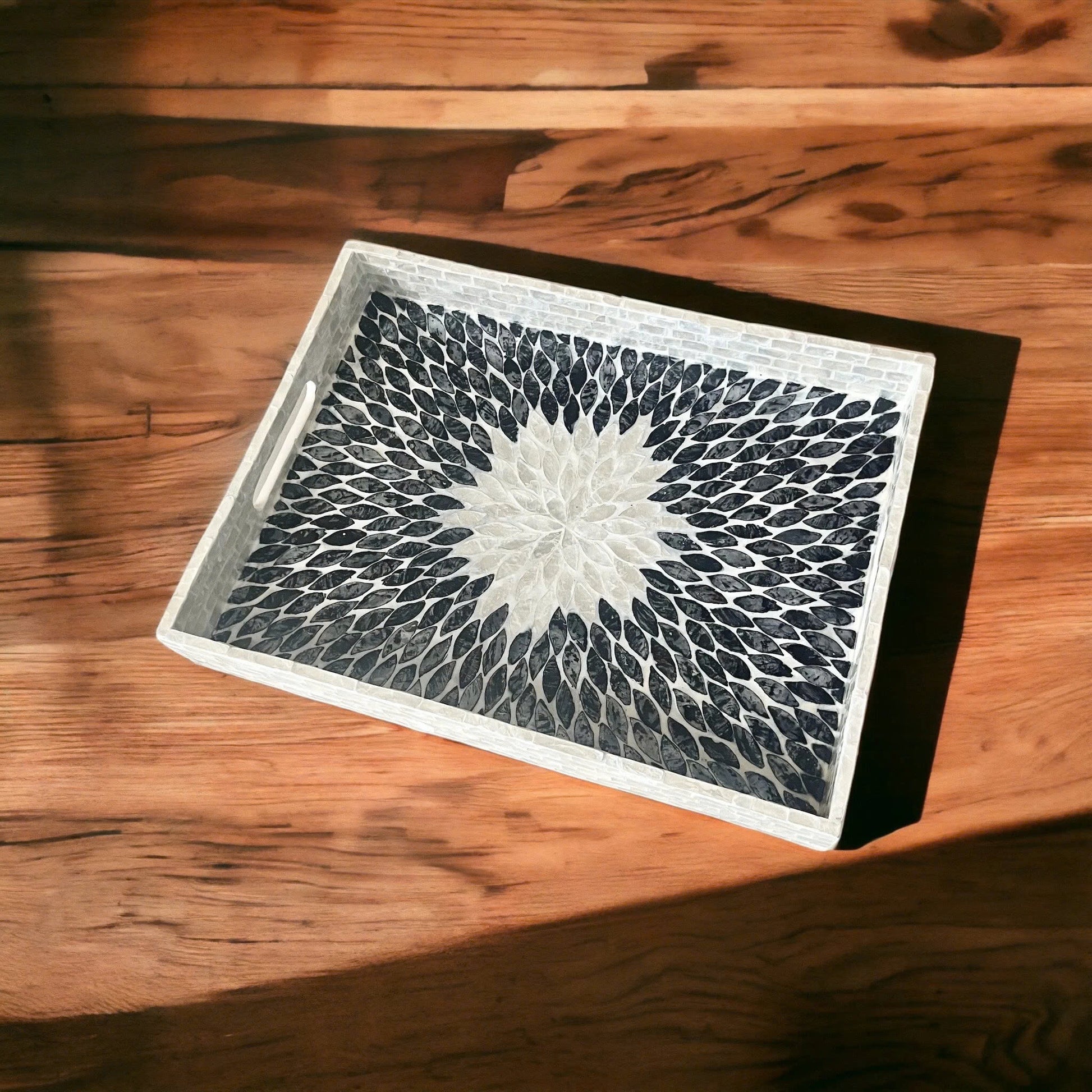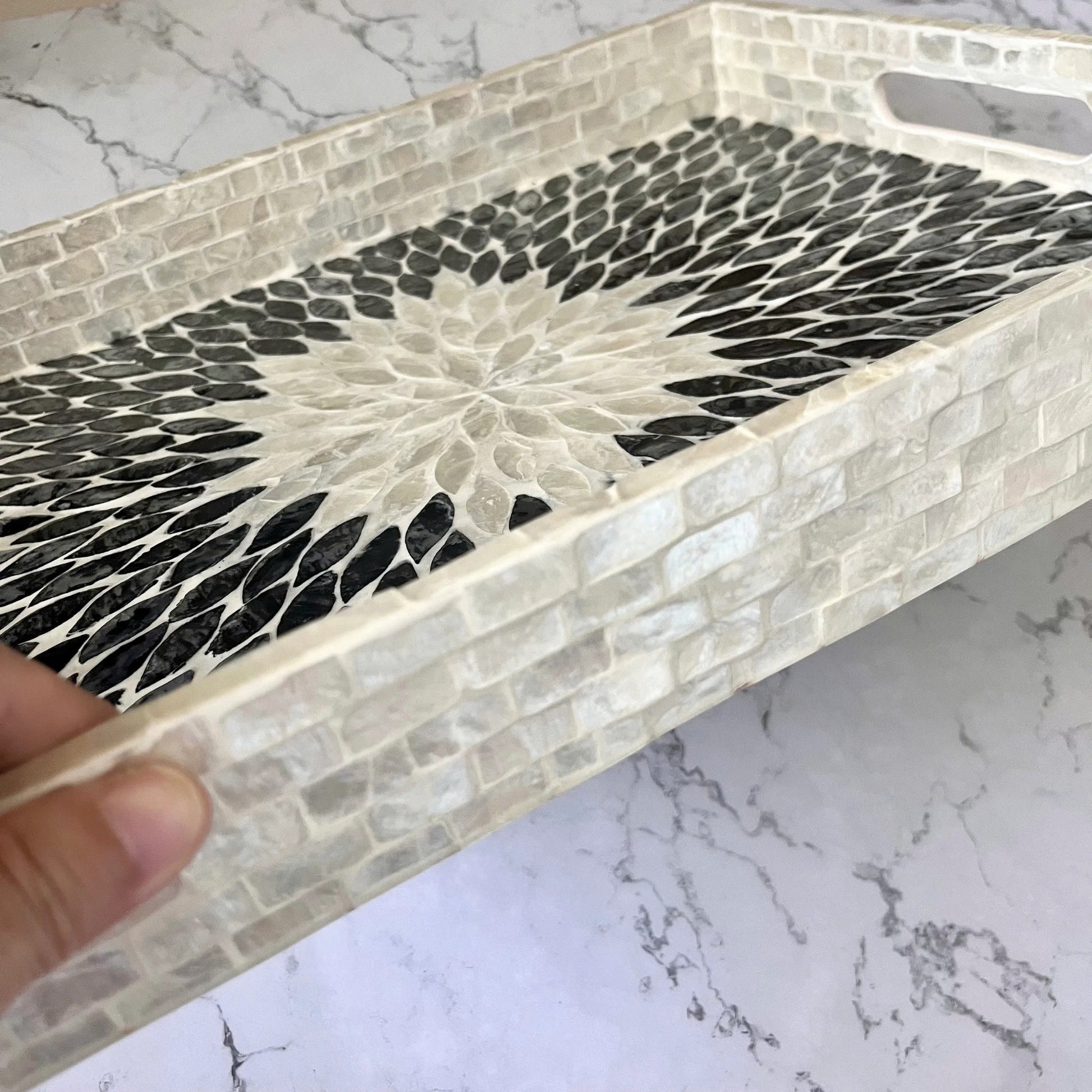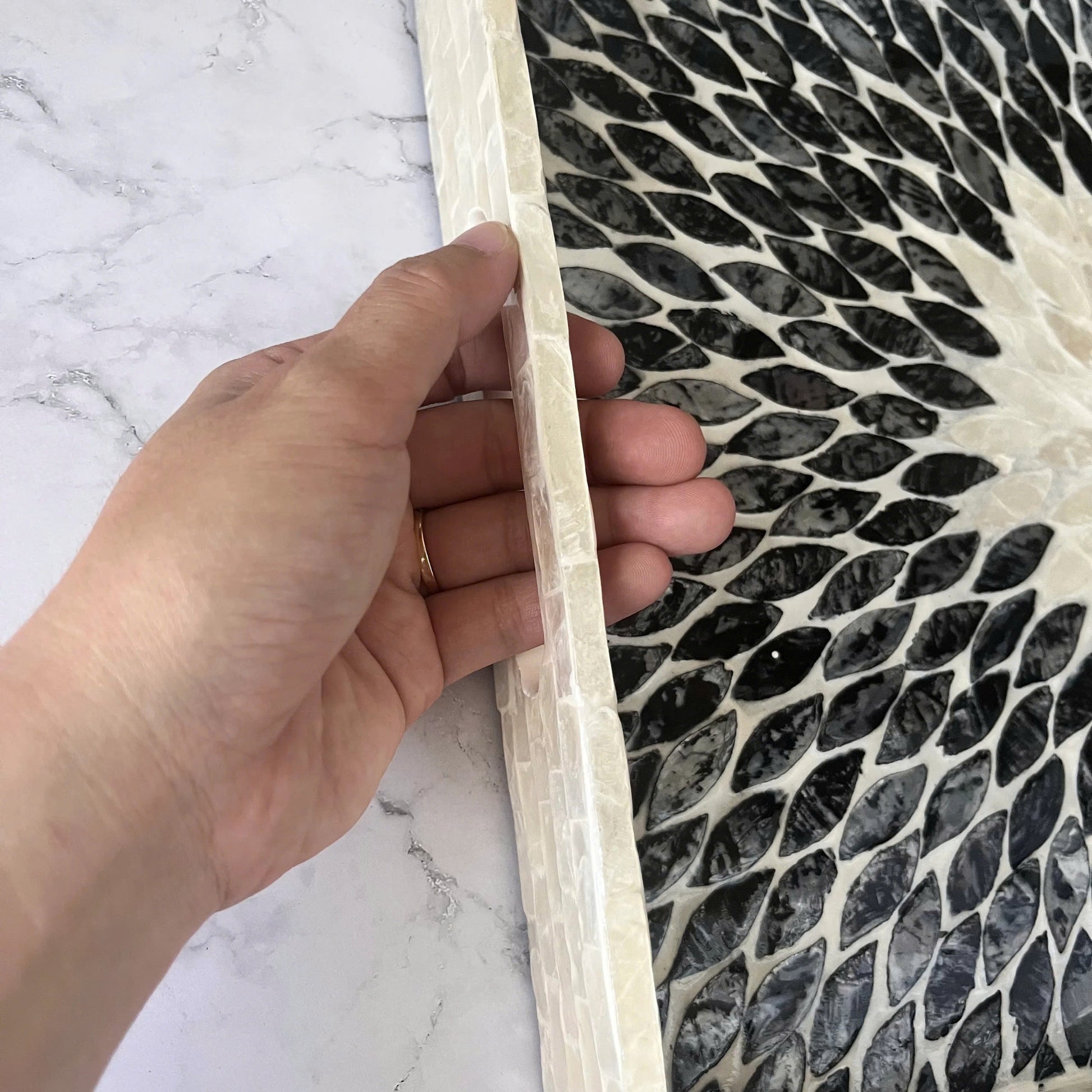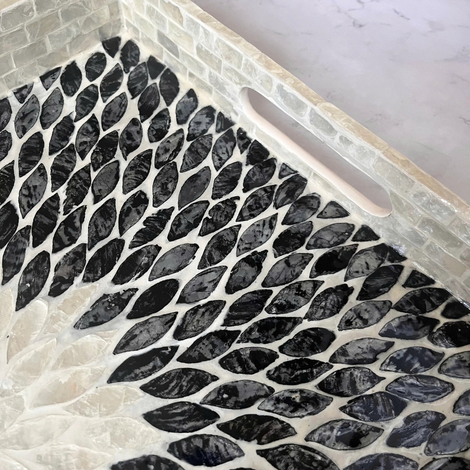 Mother of Pearl Tray with Black and White Leaf Inlay Pattern