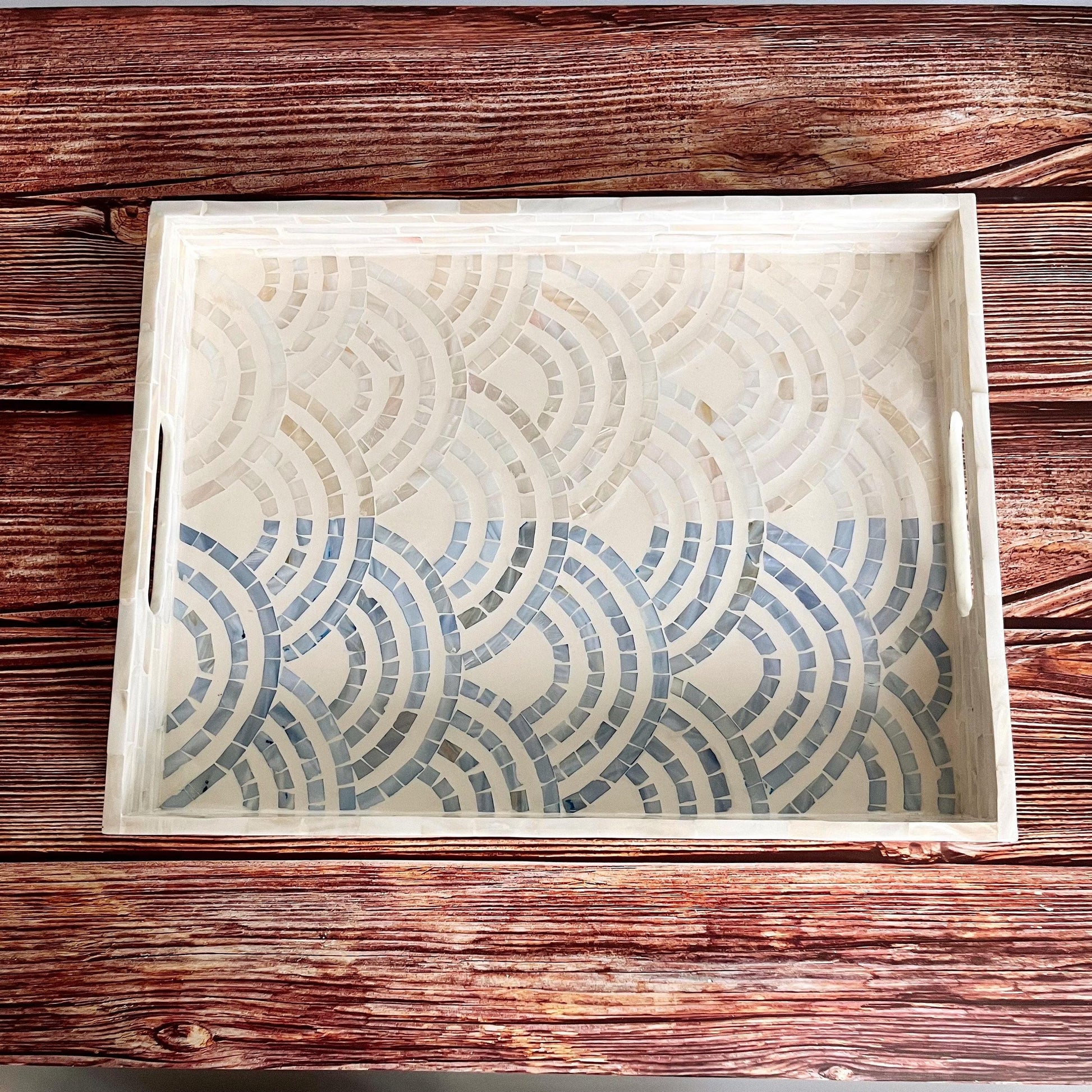 Mother of pearl rectangle serving tray, blue ocean waves pattern