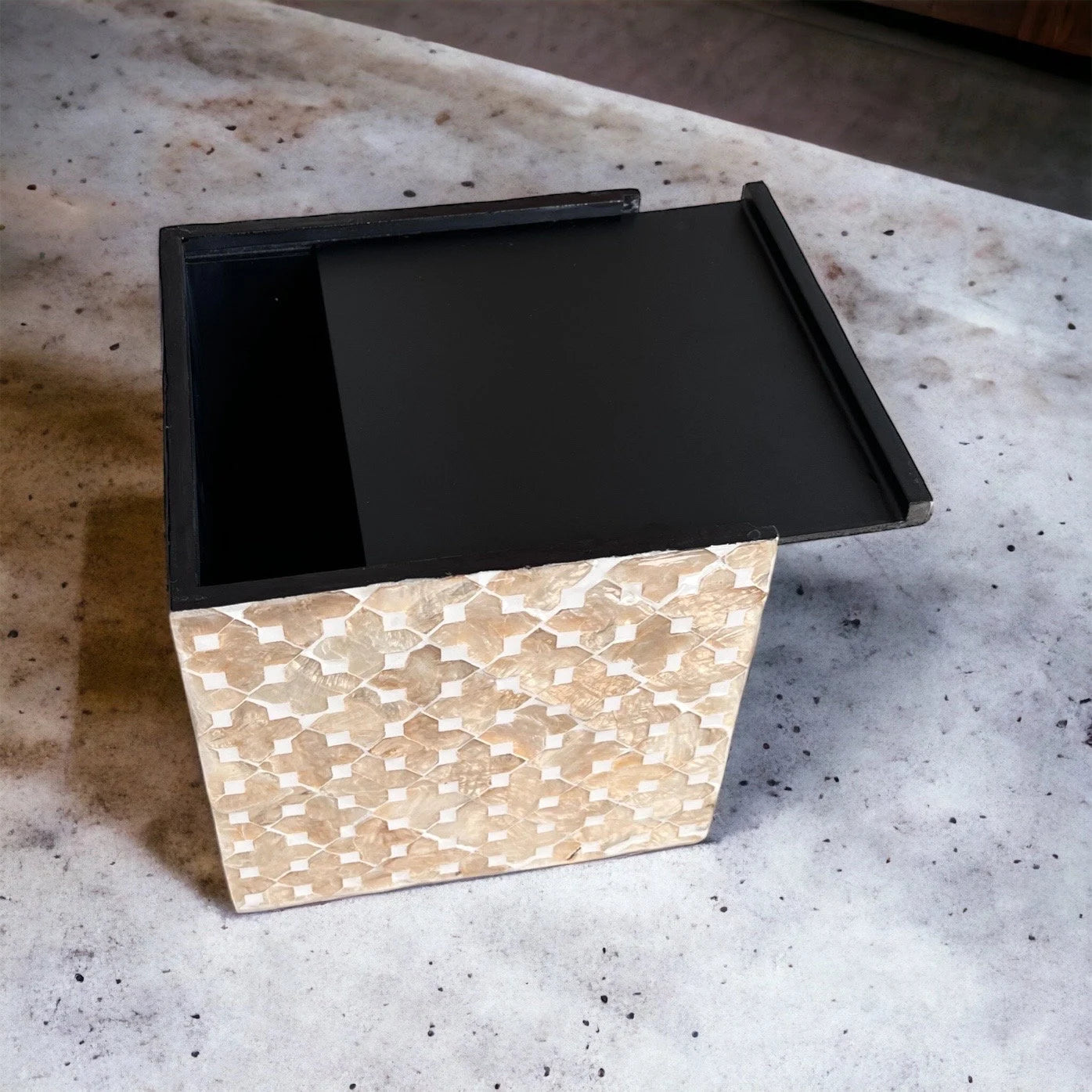 Gorgeous tissue box holder. Generous size for cube tissue box, finished to a high standard both inside (matte black) and out (mother of pearl and perhaps a lacquer finish?!?). Perfectly protected during shipping.